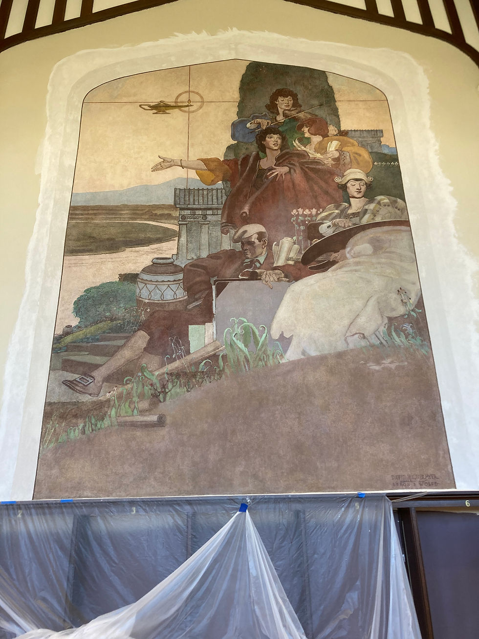 Hale Library is located at the Campus of Kansas State University. It was constructed by architects Thomas H. Beedy and Charles Cuthbert and was completed in 1927. On May 22nd of 2018, the library caught on fire causing extensive damages. The fire was located on the roof of the historic part of the building exposing the area to the surrounding elements. Five historic murals were severely damaged by prolonged exposure to water, smoke and falling debris.