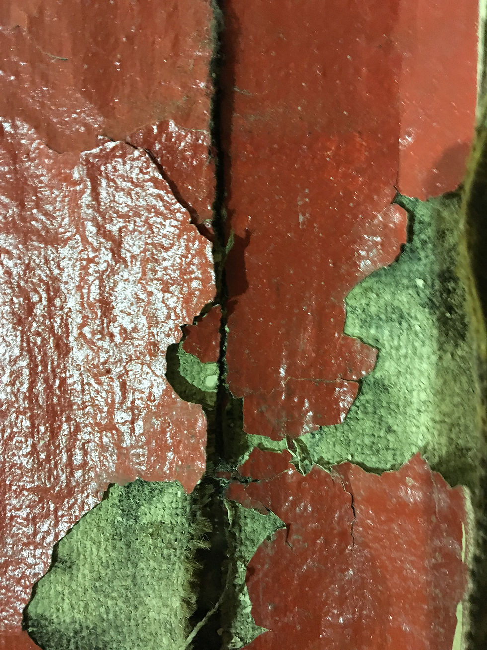 Detail of mural, drip marks from the stained wood of the ceiling caused by water damage