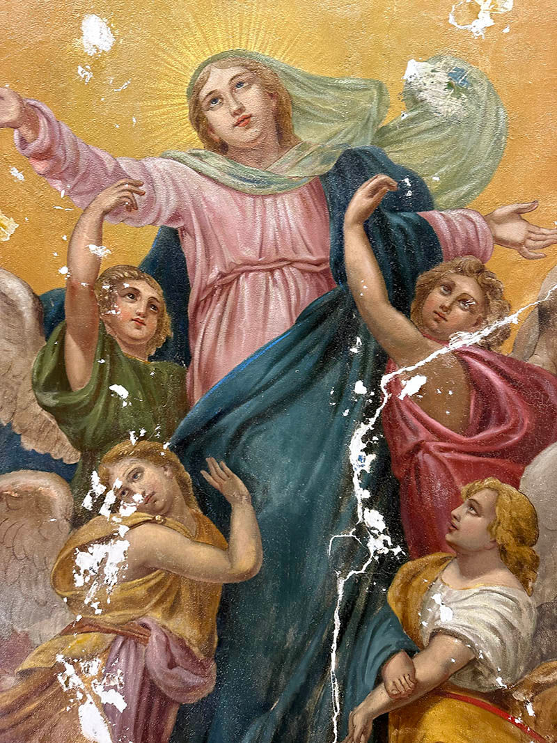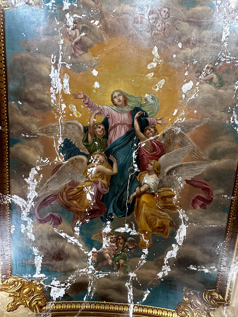 Stabilization and Adhesion: Areas suffering from water infiltration and structural instability were stabilized, cleaned, and re-adhered to the wall and ceiling surfaces, treating material such as polychromed plaster, wood panels, and gilding.