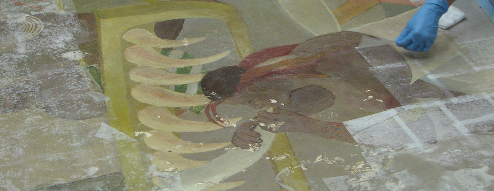 Limpeza e Consolidação: A superfície do mural foi primeiramente cuidadosamente limpa e consolidada in situ para estabilizar a camada de tinta antes da remoção.